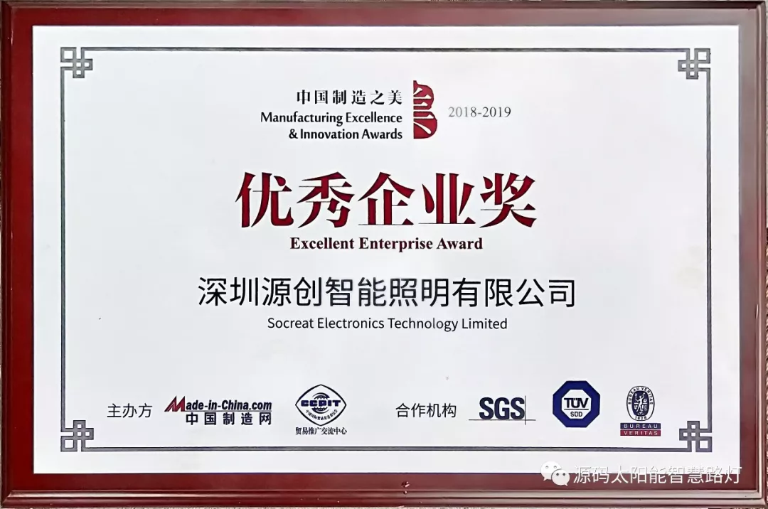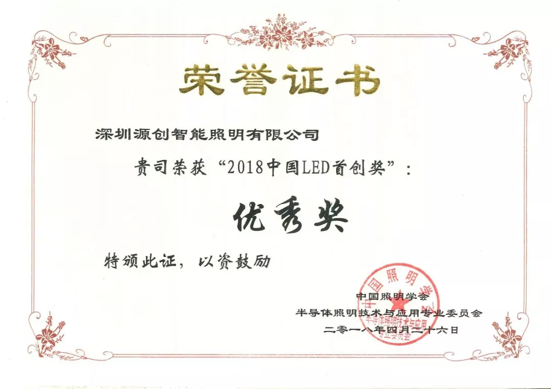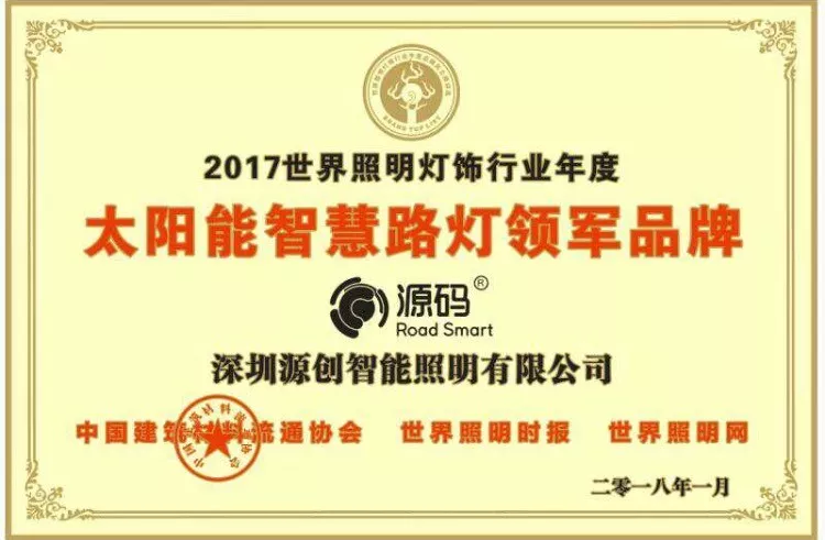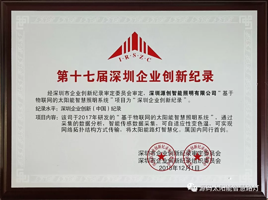 2019年1月9日,第十七屆深圳企業(yè)創(chuàng)新紀錄成果發(fā)布會暨深圳工業(yè)總會、深圳市先進制造業(yè)聯(lián)合會、深圳市企業(yè)品牌建設促進會2018年度會員大會在深圳舉行。深圳源創(chuàng)智能照明有限公司,憑借在太陽能路燈創(chuàng)新技術的突出優(yōu)勢獲得“深圳企業(yè)創(chuàng)新(中國)紀錄”獎。