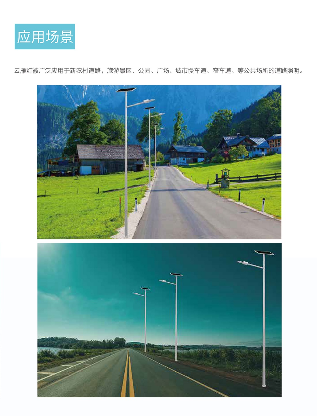 云雁燈作為分體式太陽能路燈,被廣泛應用于新農村道路、鄉鎮道路、城市窄車道,以及傳統太陽能路燈替換等場景。