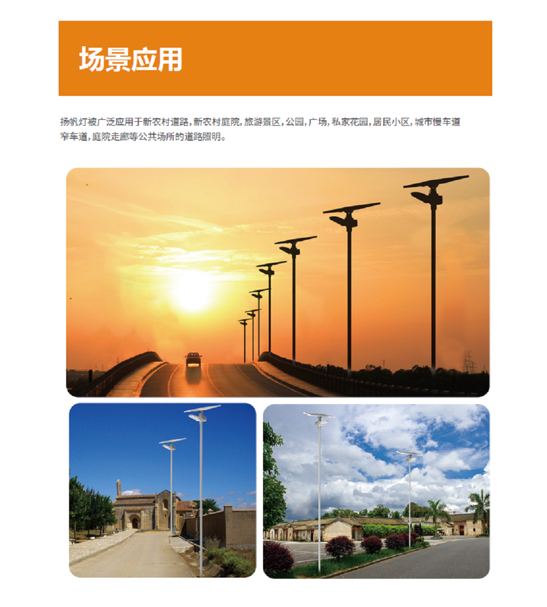 揚帆燈典范版作為揚帆燈的迭代新款,亮度和性價比均大幅提升,被廣泛應(yīng)用于新農(nóng)村道路、旅游景區(qū)、公園、廣場、居民小區(qū)、城市慢車道/窄車道等場景。